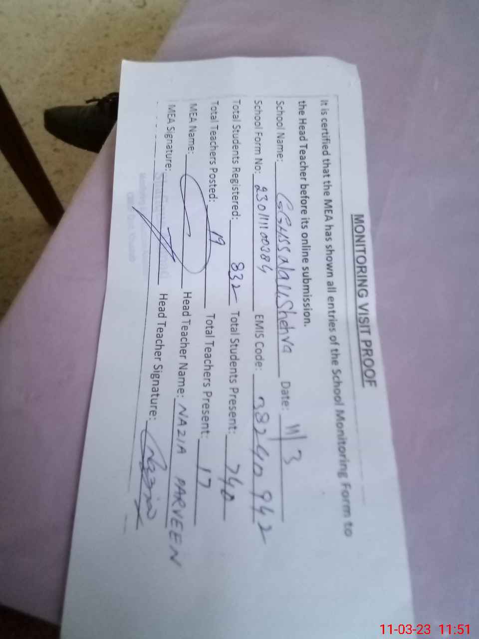 | Attendance Register | Head Teacher | MEA with School | Visit Proof |