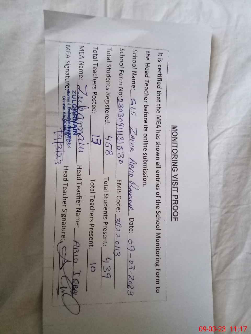 | EMIS Code: 38220113 | Name of School: GES ZAFAR ABAD RANG PUR BAGHOOR | |||