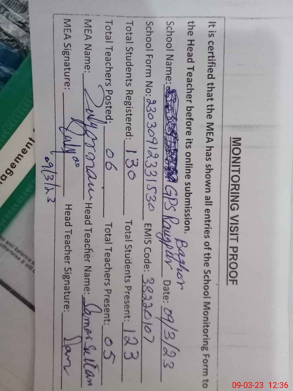 | Attendance Register | Head Teacher | MEA with School | Visit Proof |
