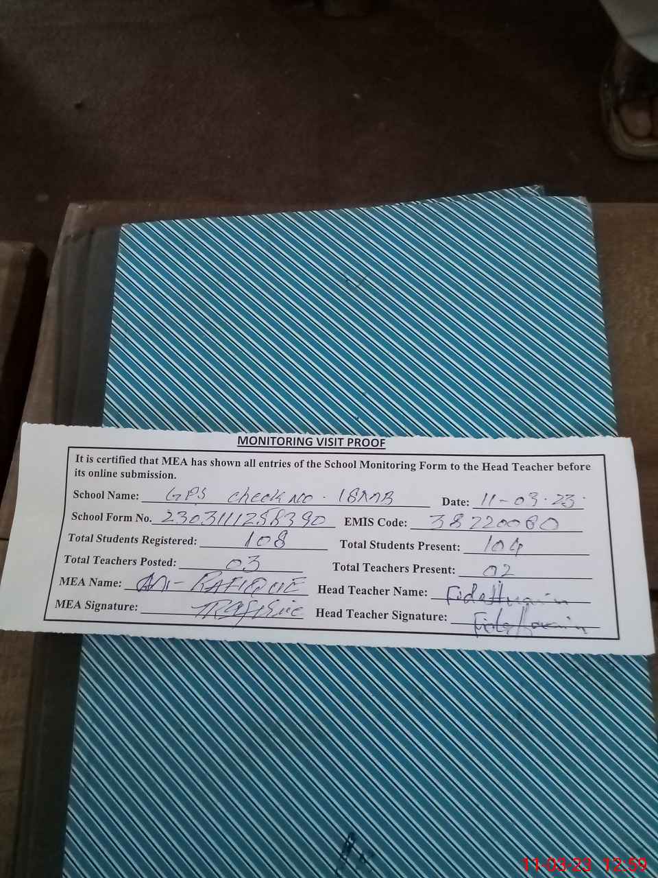 | Attendance Register | Head Teacher | MEA with School | Visit Proof |