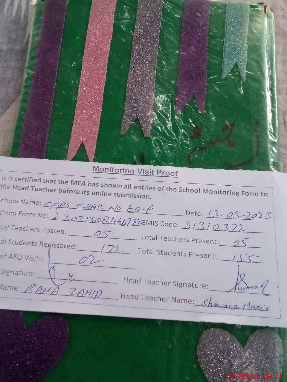 | EMIS Code: 31310372 | Name of School: GGPS CHAK NO 60/P (After Noon) | |||