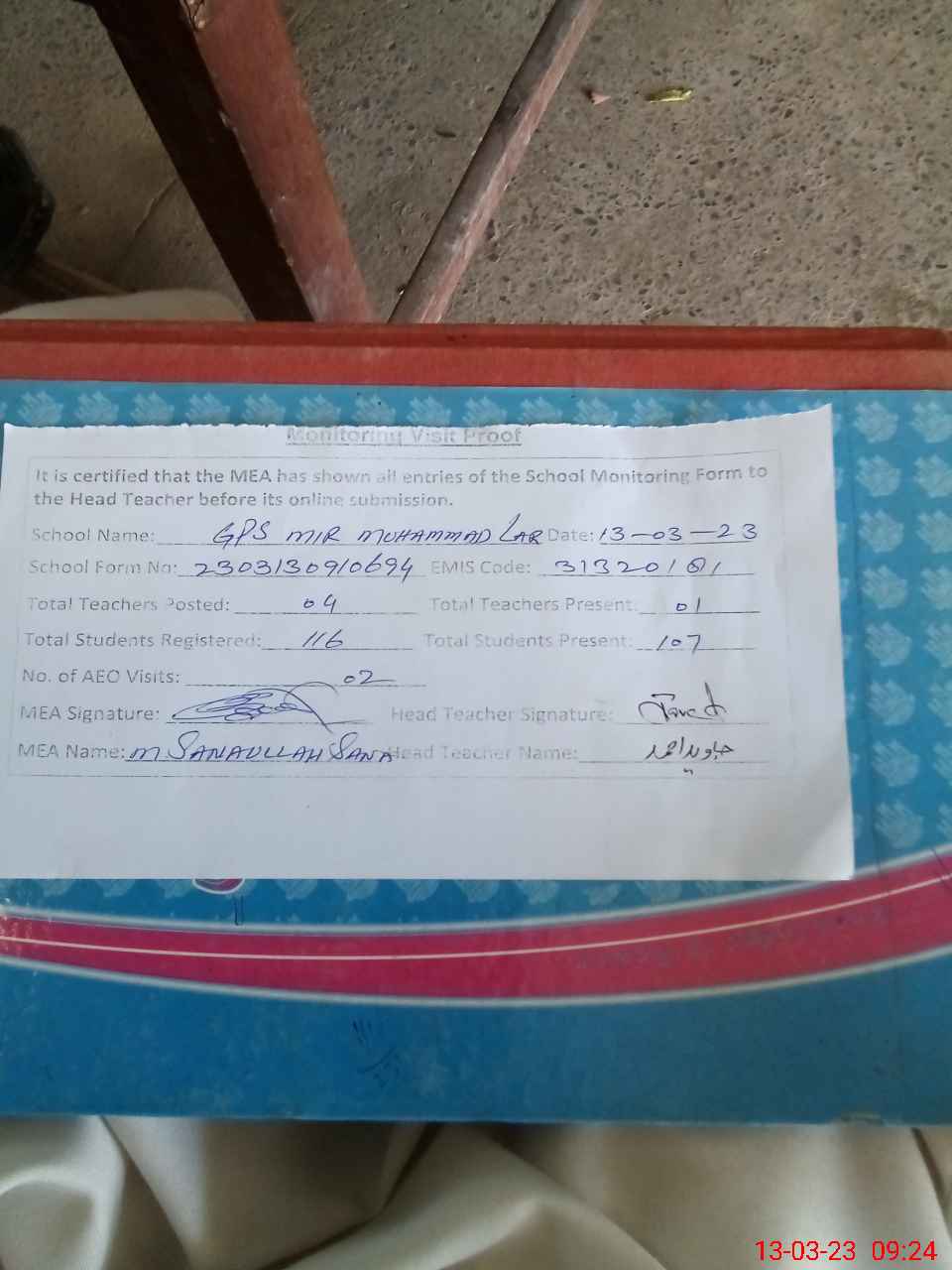 | Attendance Register | Head Teacher | MEA with School | Visit Proof |