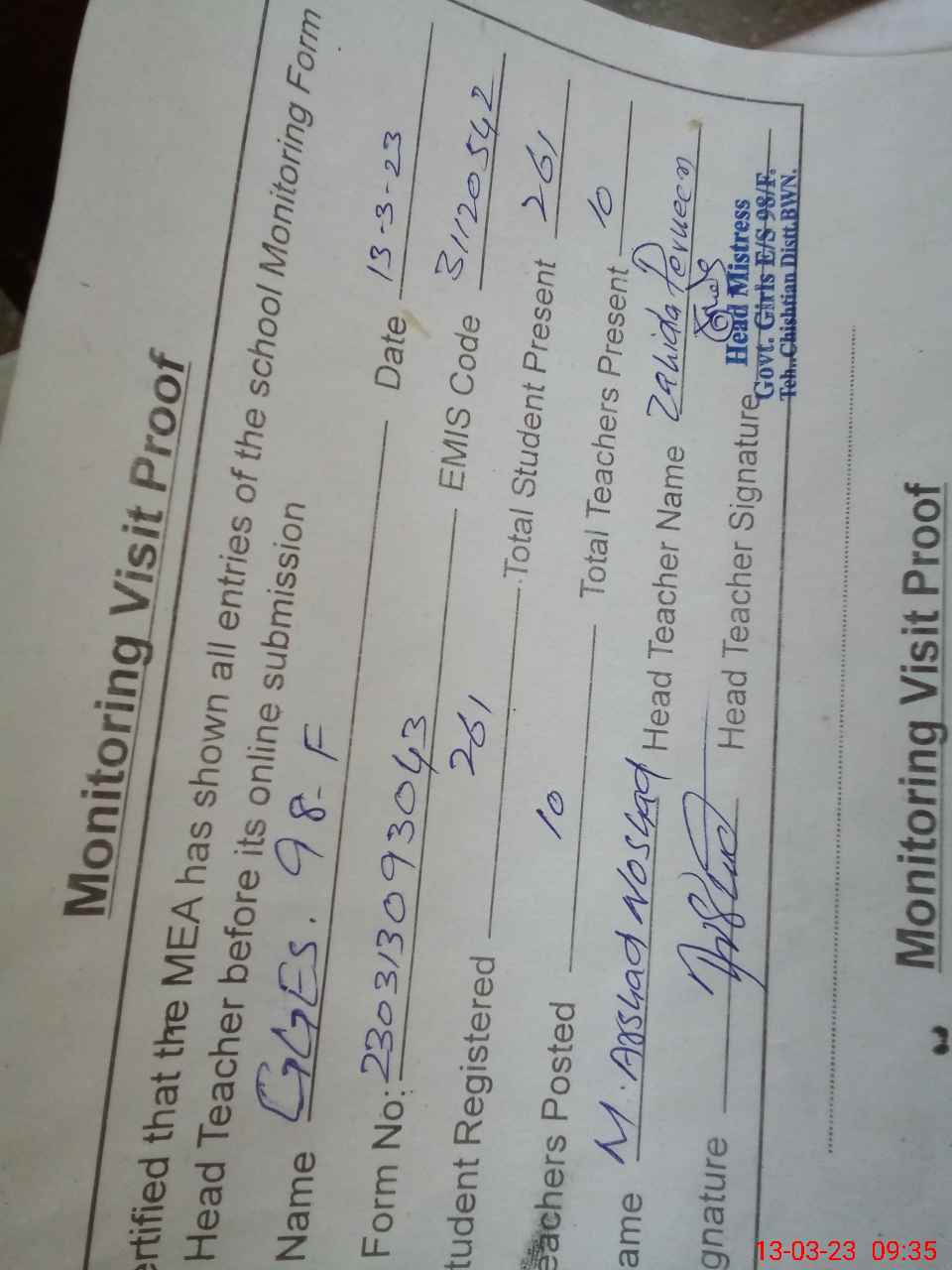 | Attendance Register | Head Teacher | MEA with School | Visit Proof |