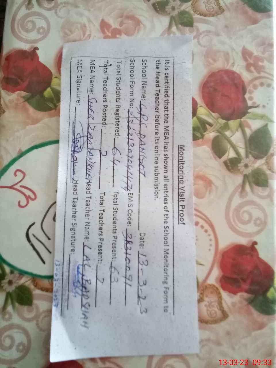 | Attendance Register | Head Teacher | MEA with School | Visit Proof |