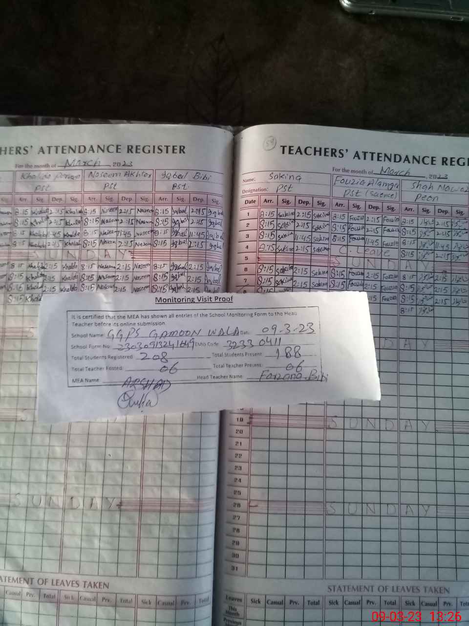| Attendance Register | Head Teacher | MEA with School | Visit Proof |