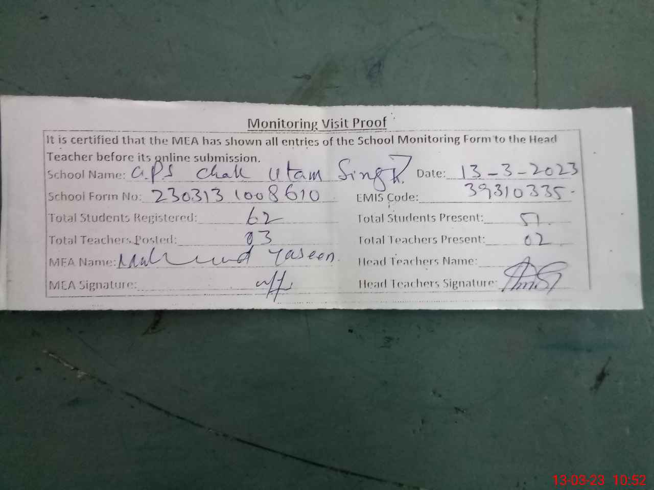 | Attendance Register | Head Teacher | MEA with School | Visit Proof |
