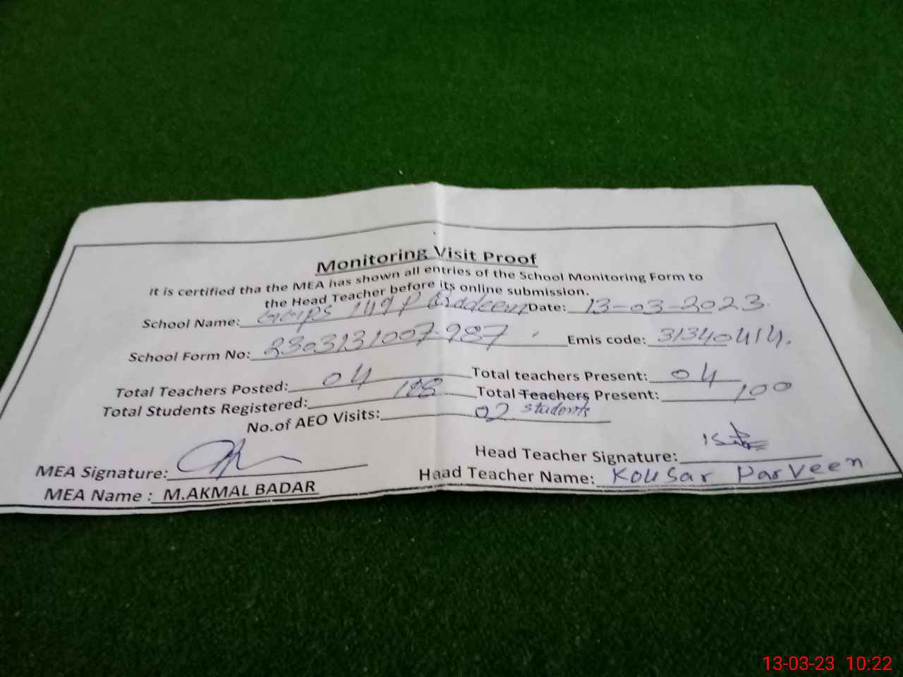 | Attendance Register | Head Teacher | MEA with School | Visit Proof |