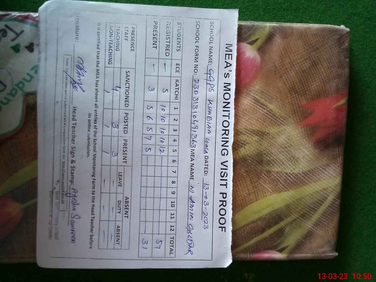| Attendance Register | Head Teacher | MEA with School | Visit Proof |