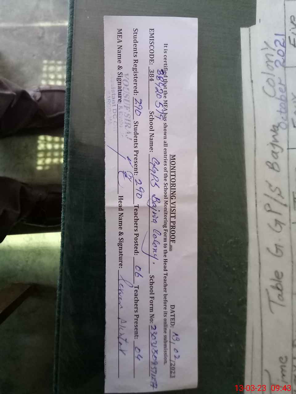 | Certified that this School was Inspected by the Undersigned MEA/DMO Today and the Information Stated Above is as Per Record. | |||||