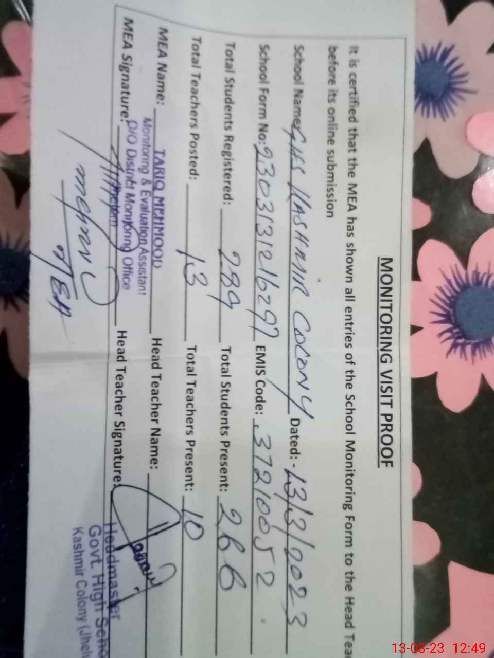 | EMIS Code: 37210052 | Name of School: GHS KASHMIR COLONY JHELUM | |||