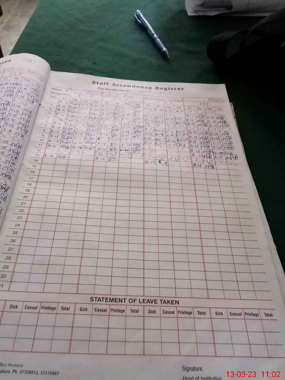 | CNIC | Full Name | Designation | R/C | Absence During Last Calender Month |