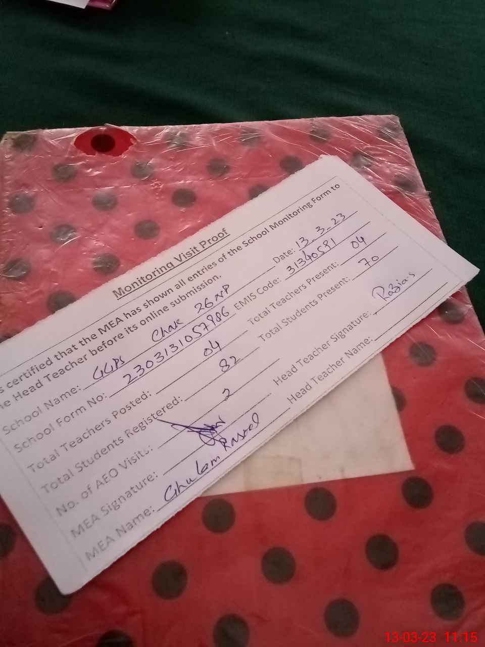 | Attendance Register | Head Teacher | MEA with School | Visit Proof |