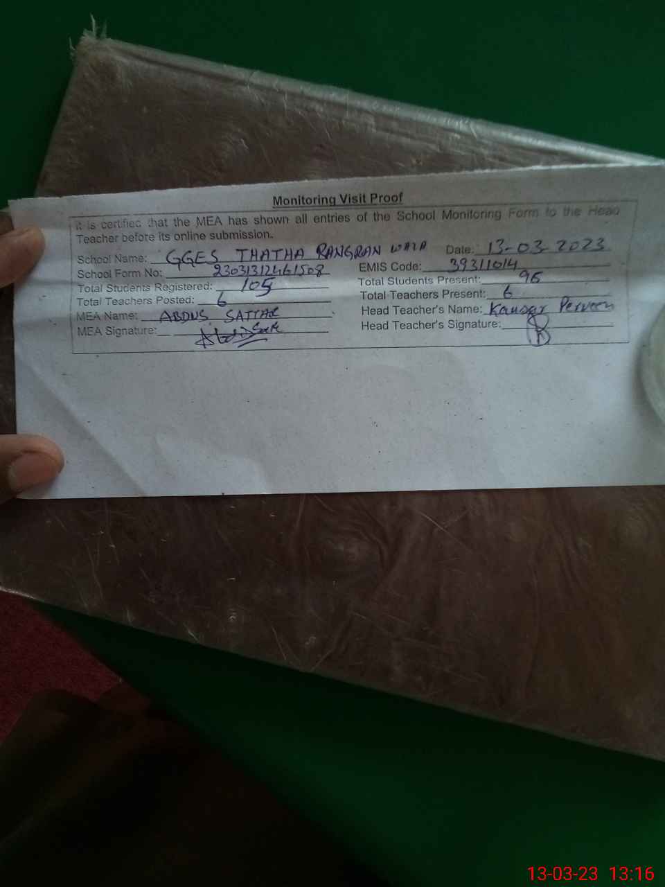 | Attendance Register | Head Teacher | MEA with School | Visit Proof |