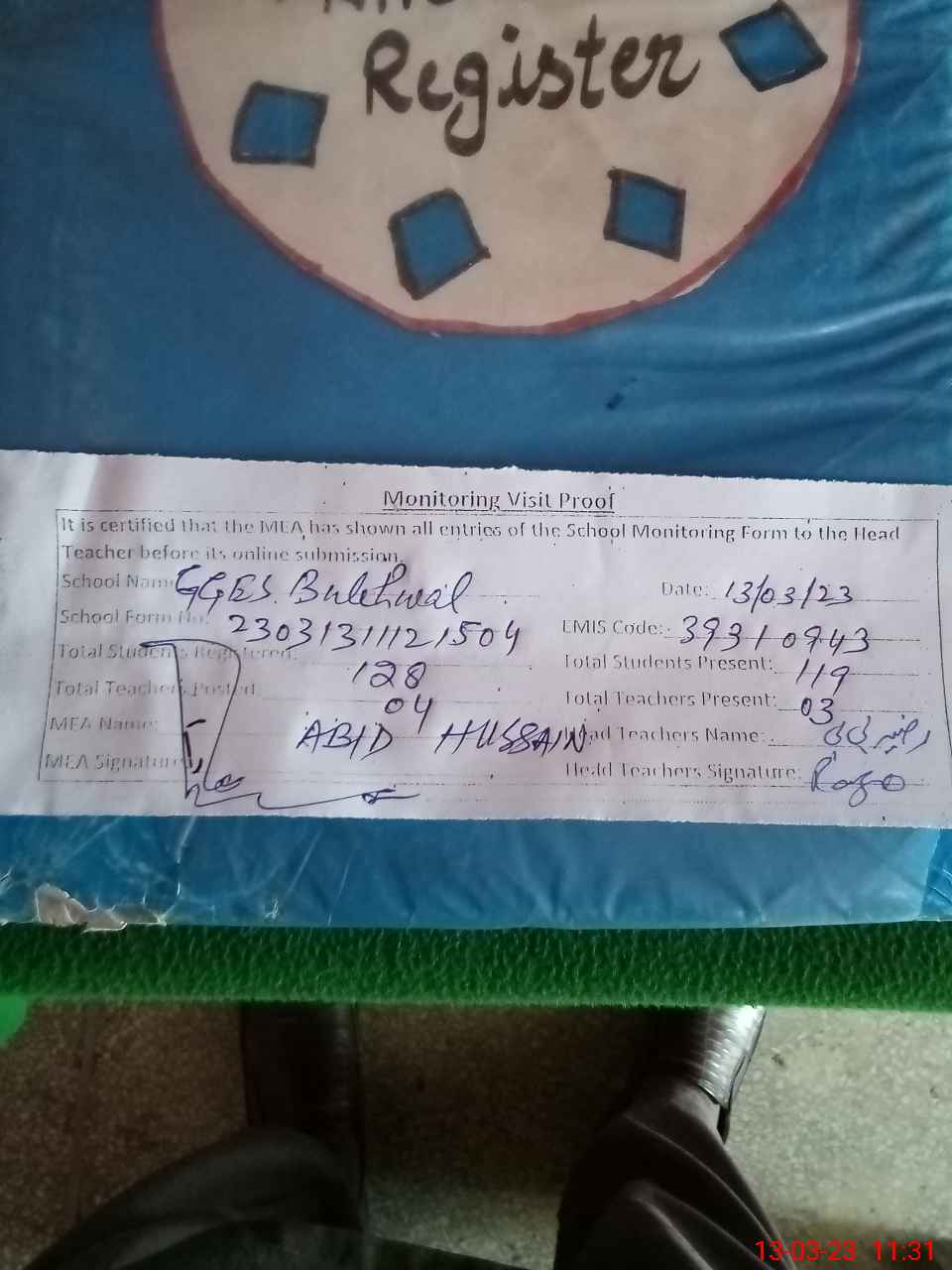 | Attendance Register | Head Teacher | MEA with School | Visit Proof |