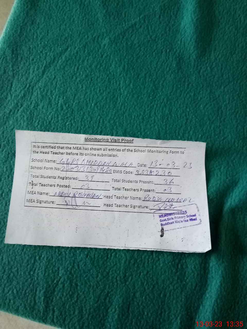 | Attendance Register | Head Teacher | MEA with School | Visit Proof |