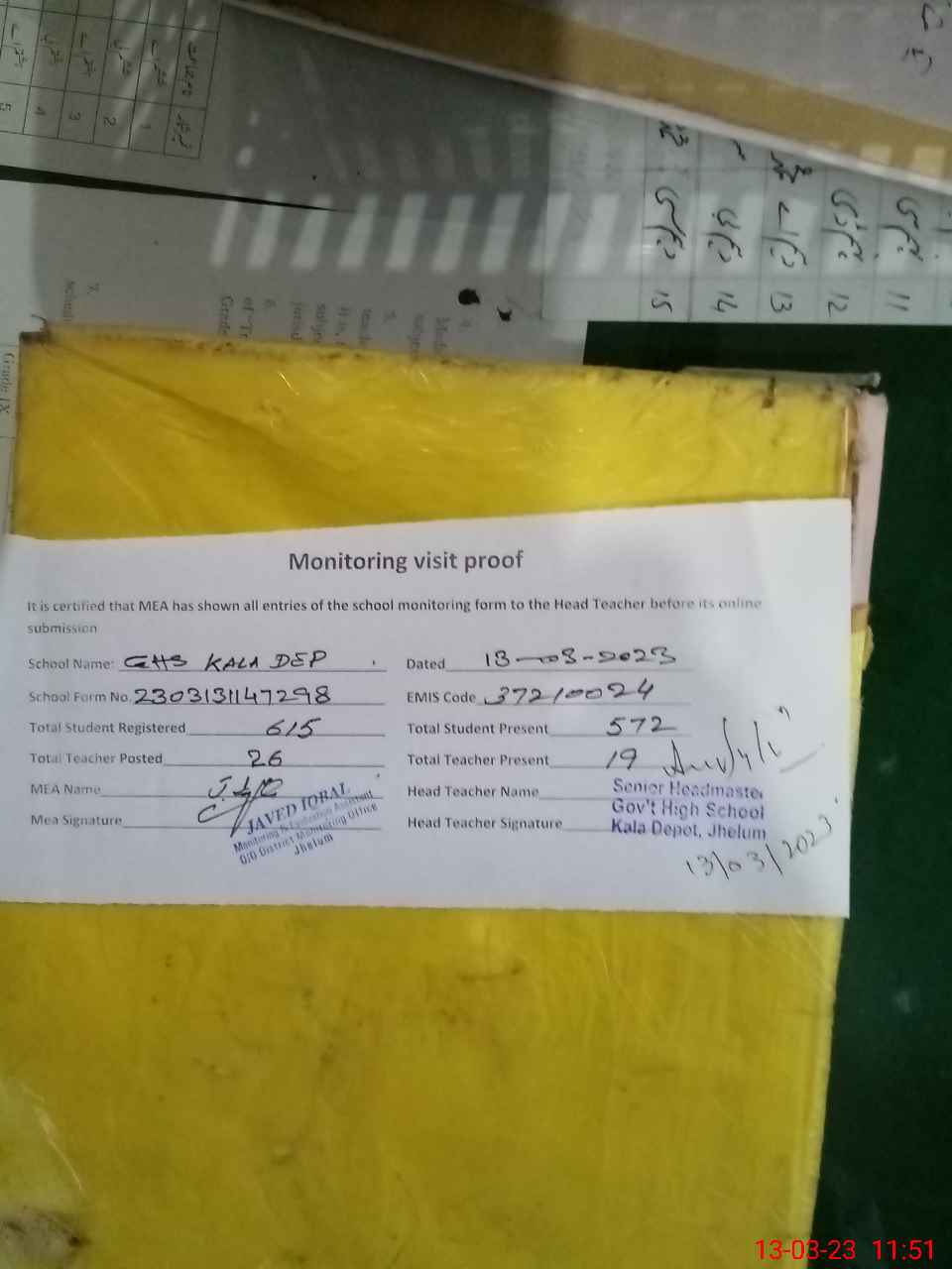 | Attendance Register | Head Teacher | MEA with School | Visit Proof |