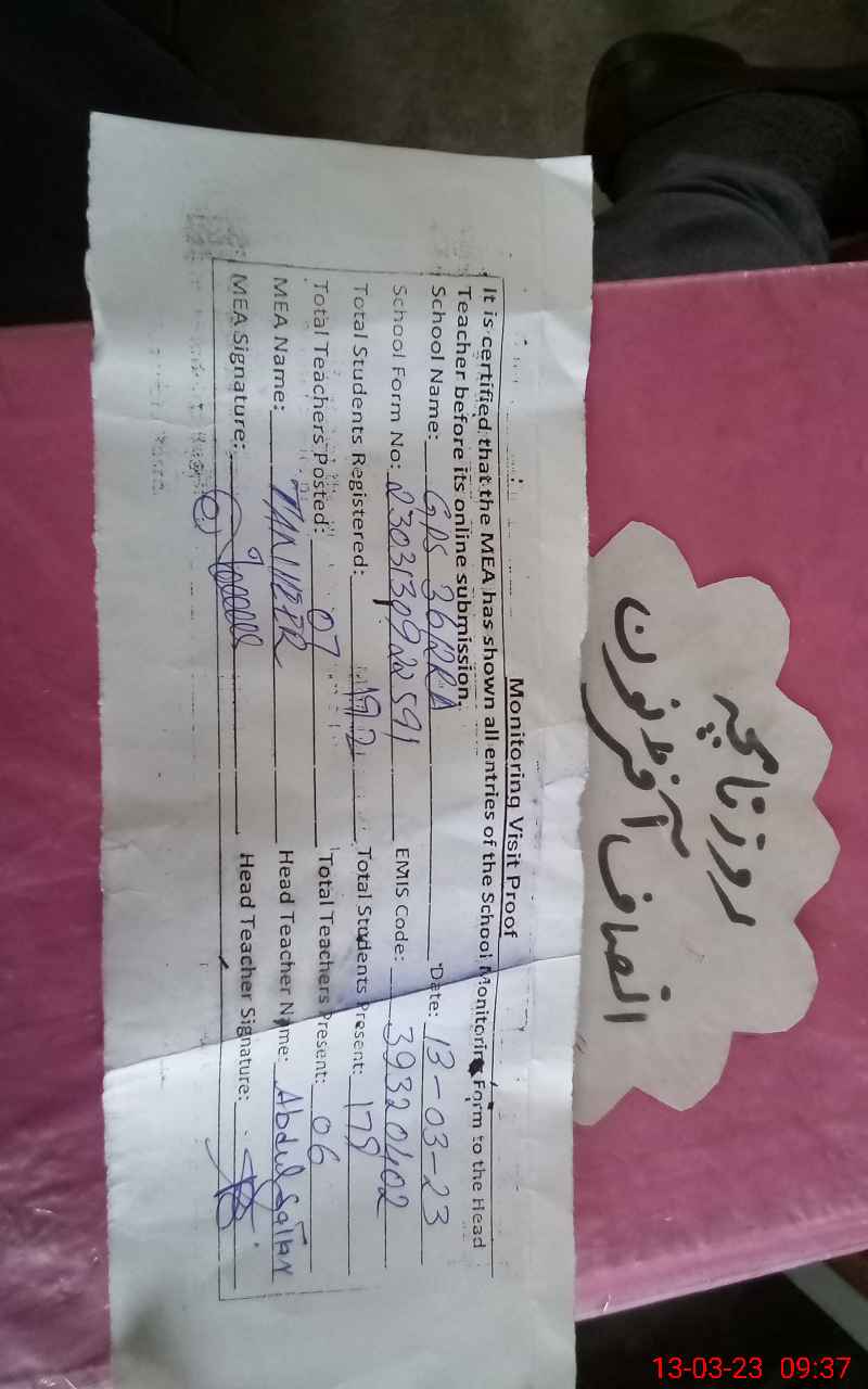 | Attendance Register | Head Teacher | MEA with School | Visit Proof |