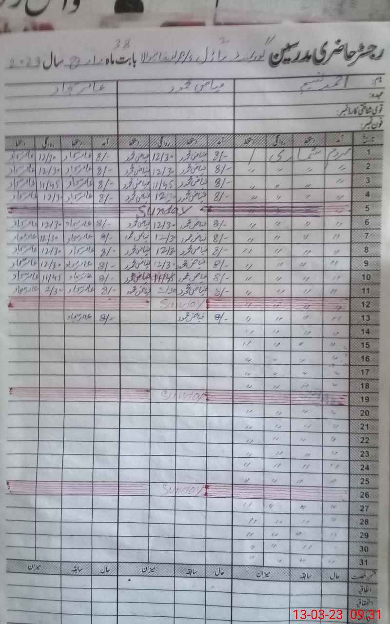 | CNIC | Full Name | Designation | R/C | Absence During Last Calender Month |