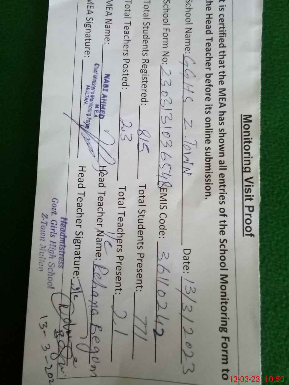 | Name: No**** Kh**** Ta**** Designation: (School Headmaster's/Headmistress's) HEADMASTER Phone/Cell Number: 03**** |