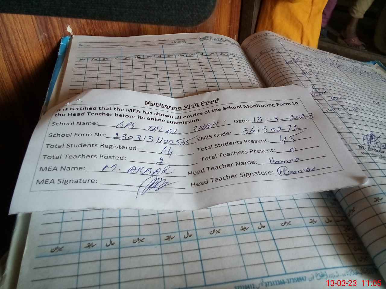 | Attendance Register | Head Teacher | MEA with School | Visit Proof |