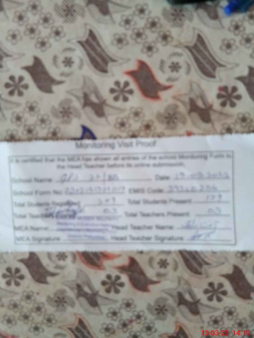 | Attendance Register | Head Teacher | MEA with School | Visit Proof |