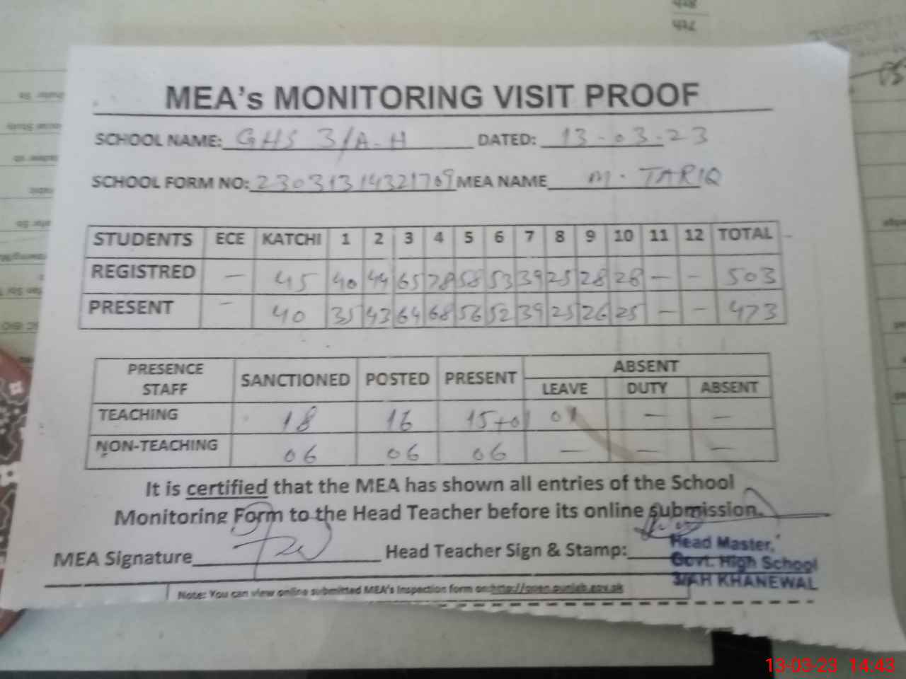 | Attendance Register | Head Teacher | MEA with School | Visit Proof |