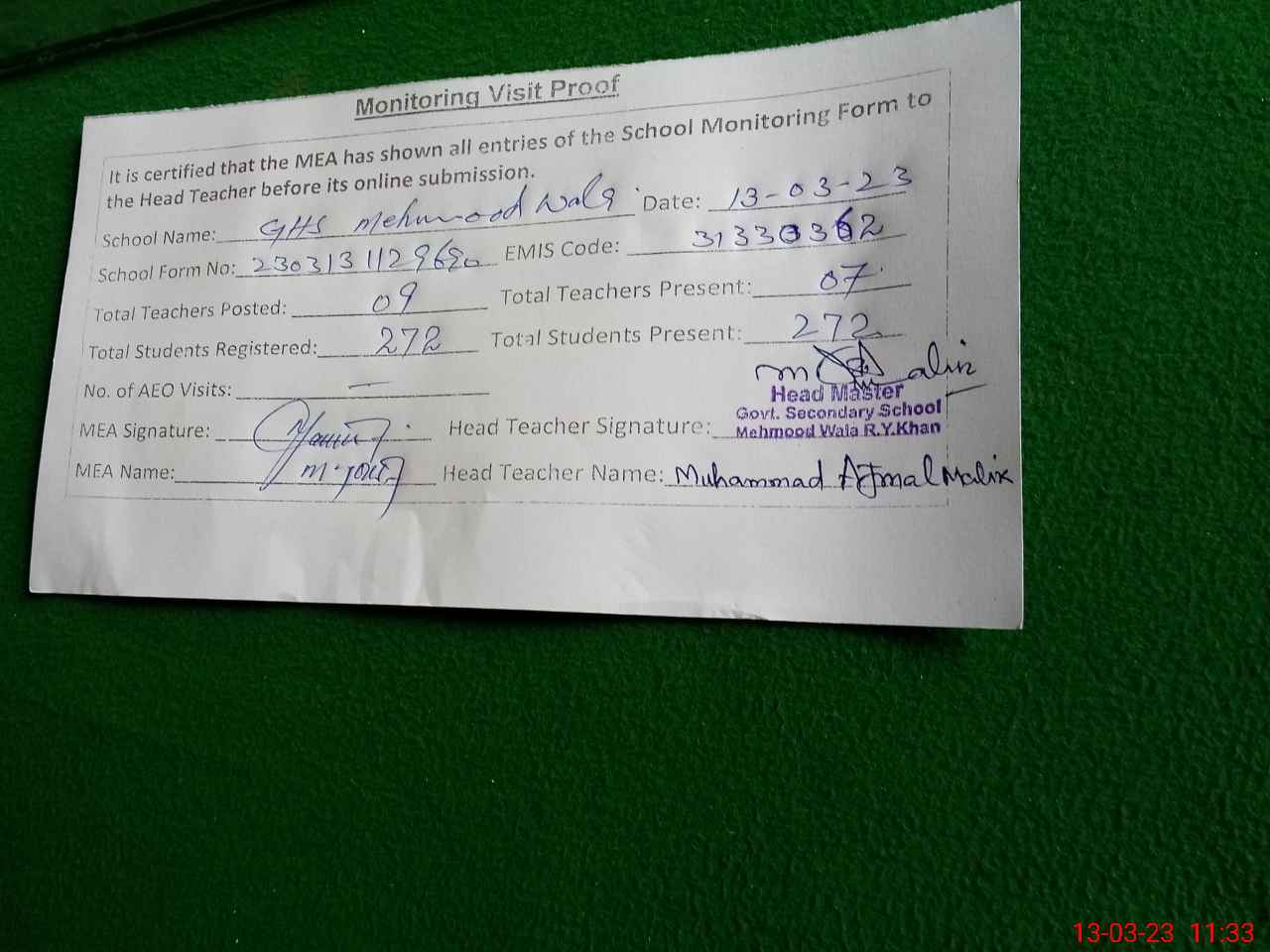 | EMIS Code: 31330362 | Name of School: GHS MEHMOOD WALA | |||