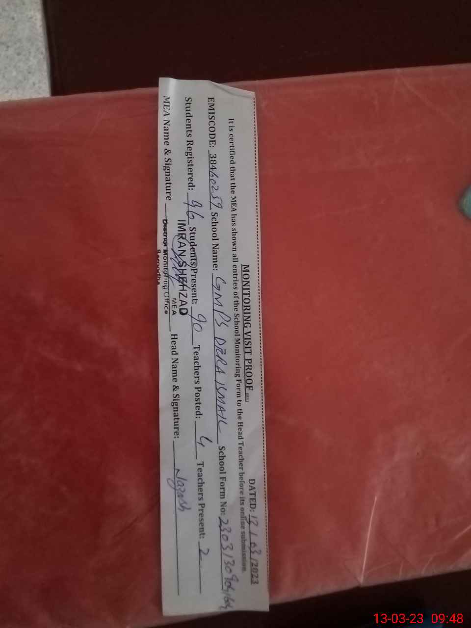 | Attendance Register | Head Teacher | MEA with School | Visit Proof |