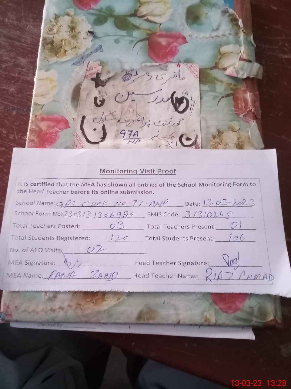 | EMIS Code: 31310245 | Name of School: GPS CHAK NO 97 ANP | |||