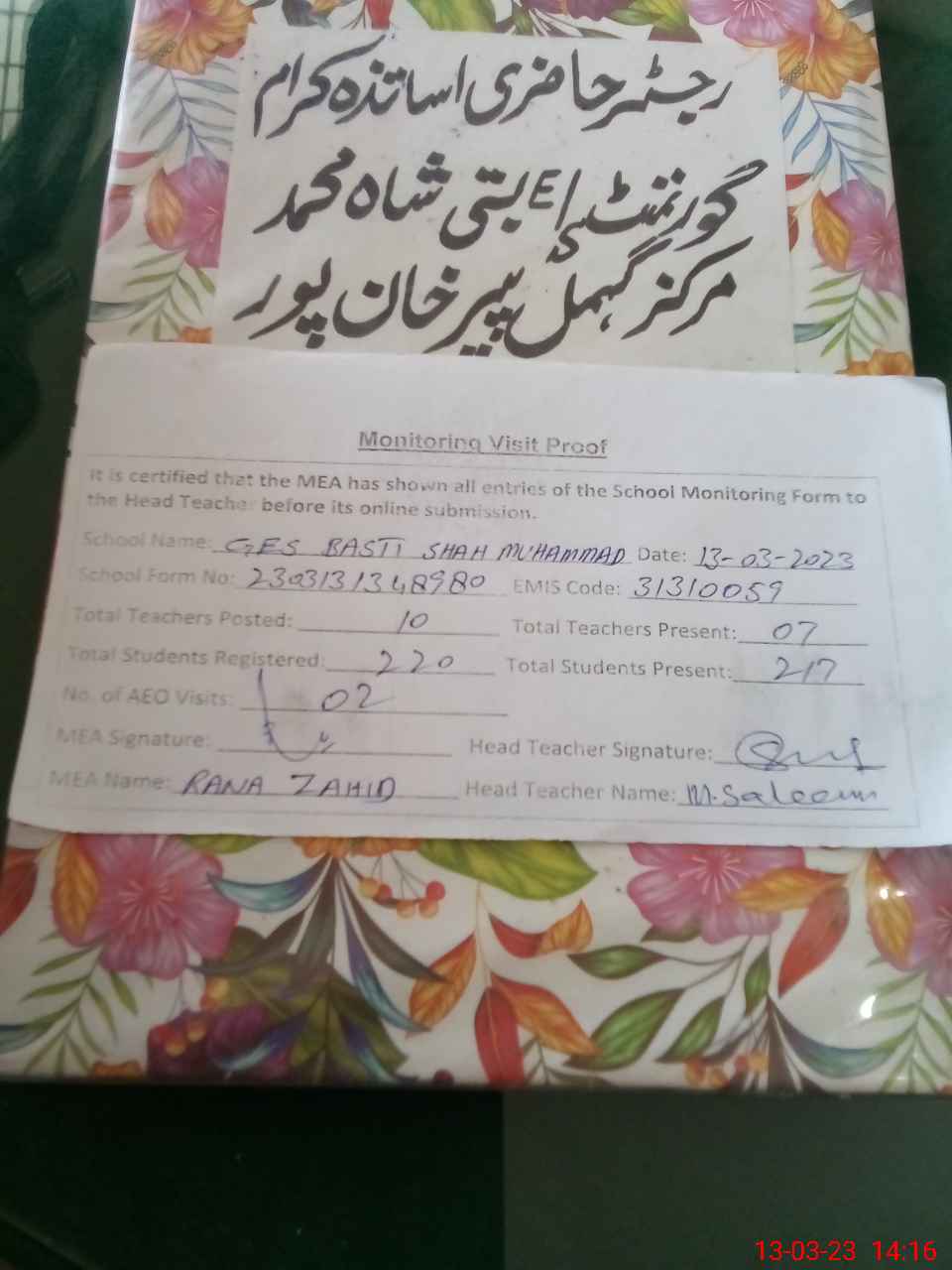 | EMIS Code: 31310059 | Name of School: GHS BASTI SHAH MUHAMMAD | |||