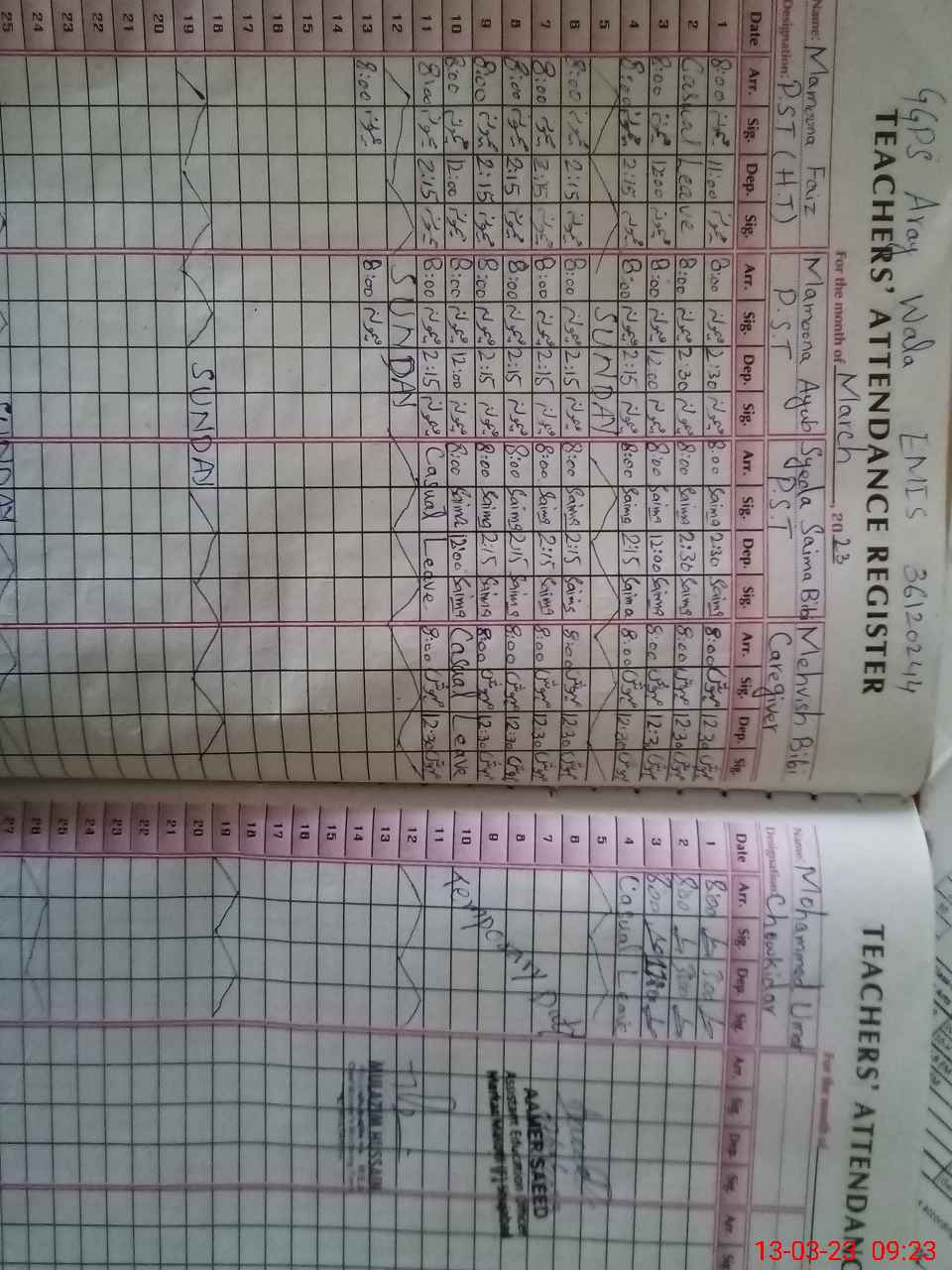 | Remarks (Use Separate Page if Required): 02 teacher Memona ayub and saima Bibi absent There was sign on attendance register of Memona ayub but was not present in school came later at 0908 and told gone for breakfast 01 toilet dirty no soap | |||||
