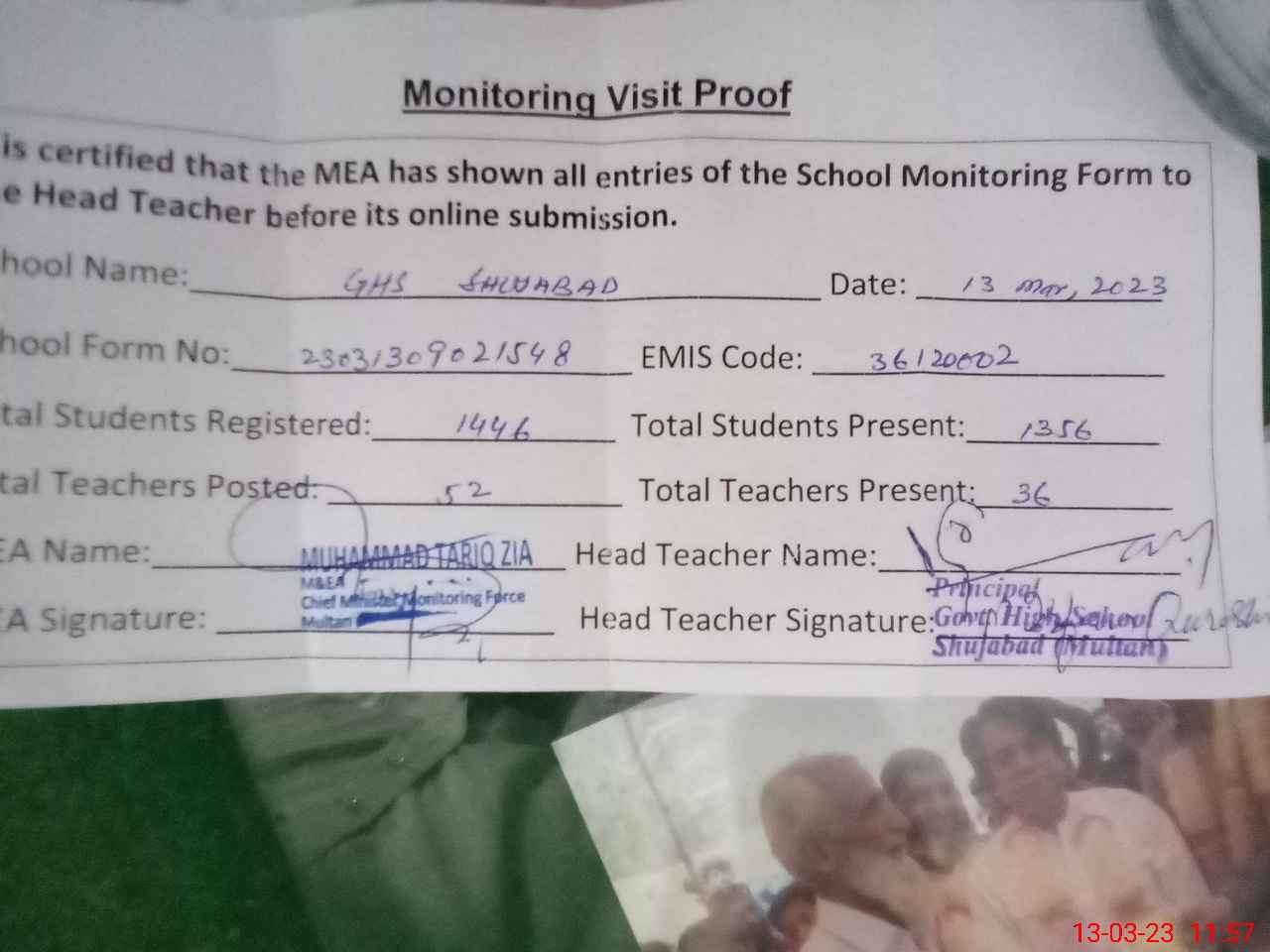 | Attendance Register | Head Teacher | MEA with School | Visit Proof |