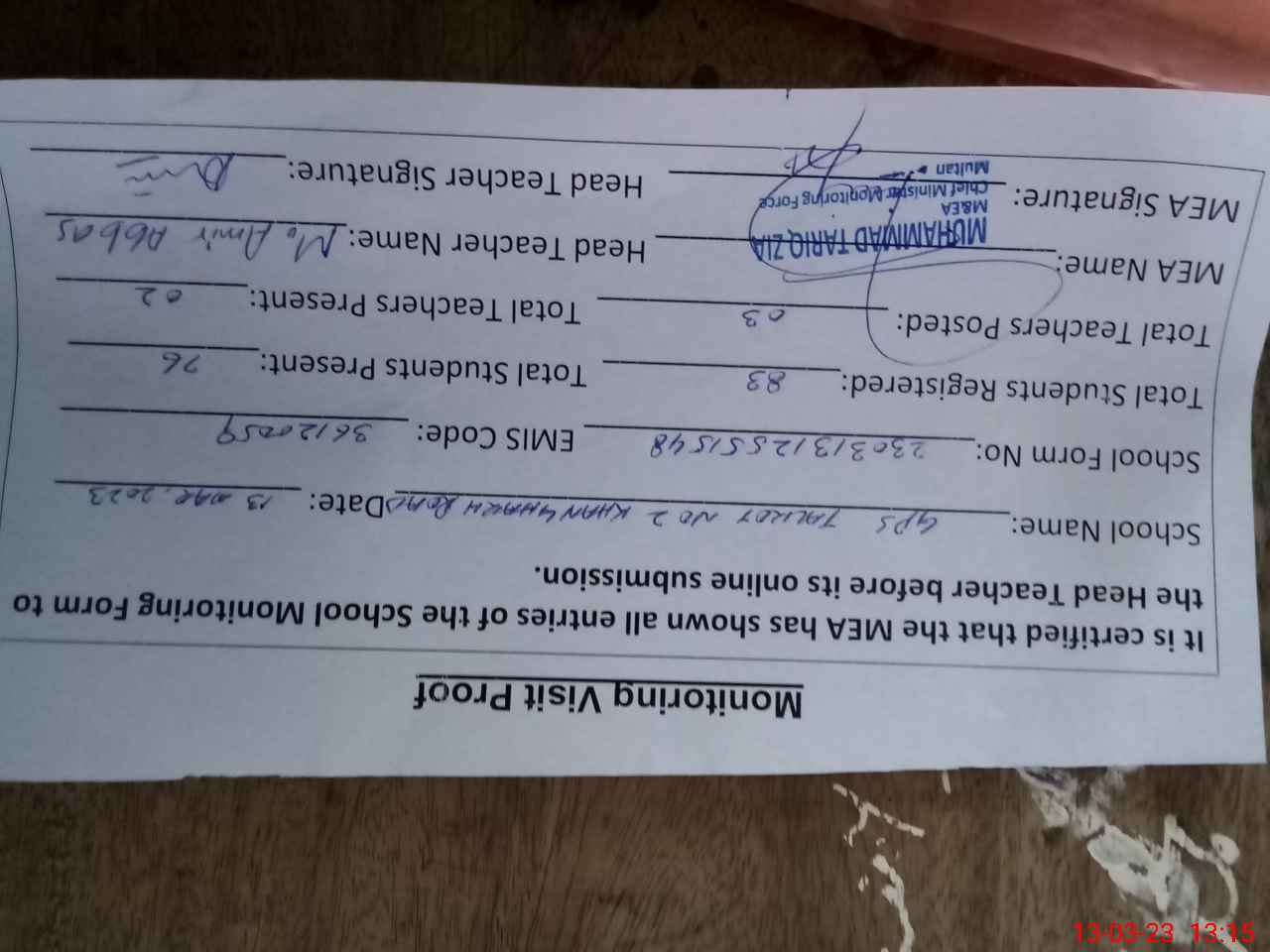 | Attendance Register | Head Teacher | MEA with School | Visit Proof |