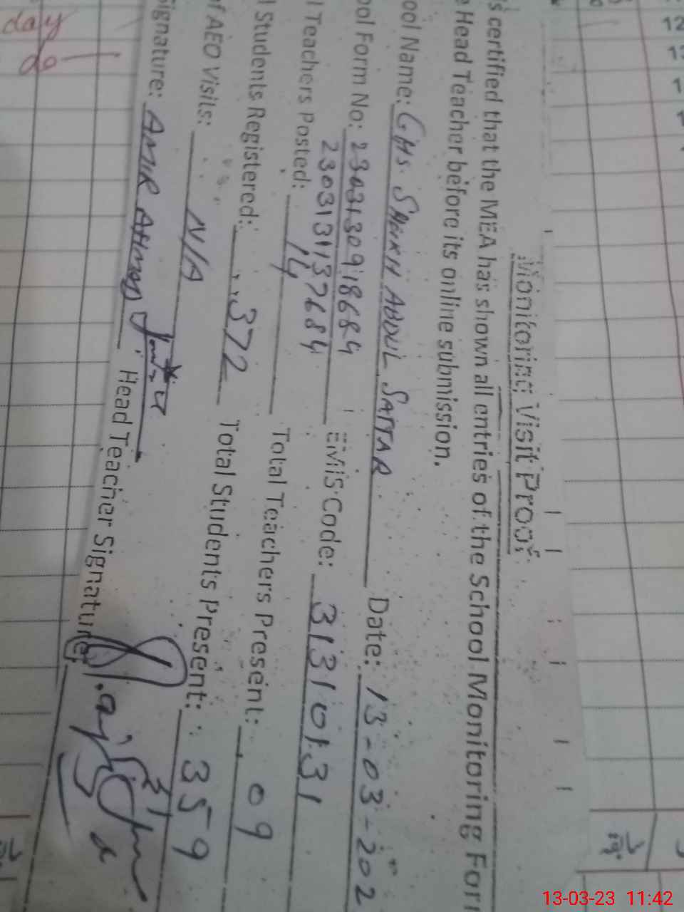 | Attendance Register | Head Teacher | MEA with School | Visit Proof |
