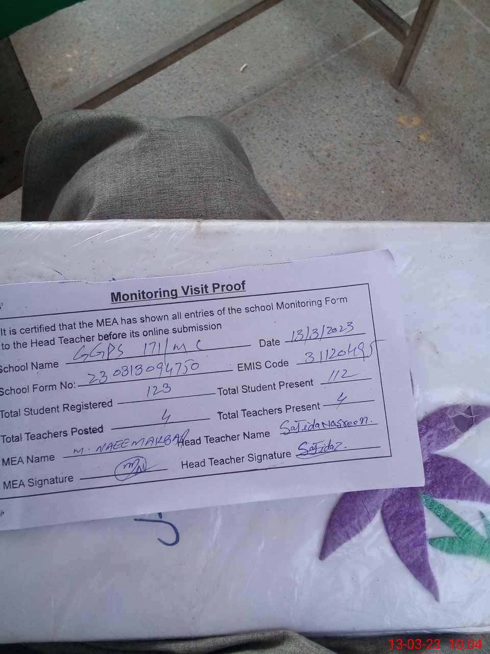 | Attendance Register | Head Teacher | MEA with School | Visit Proof |