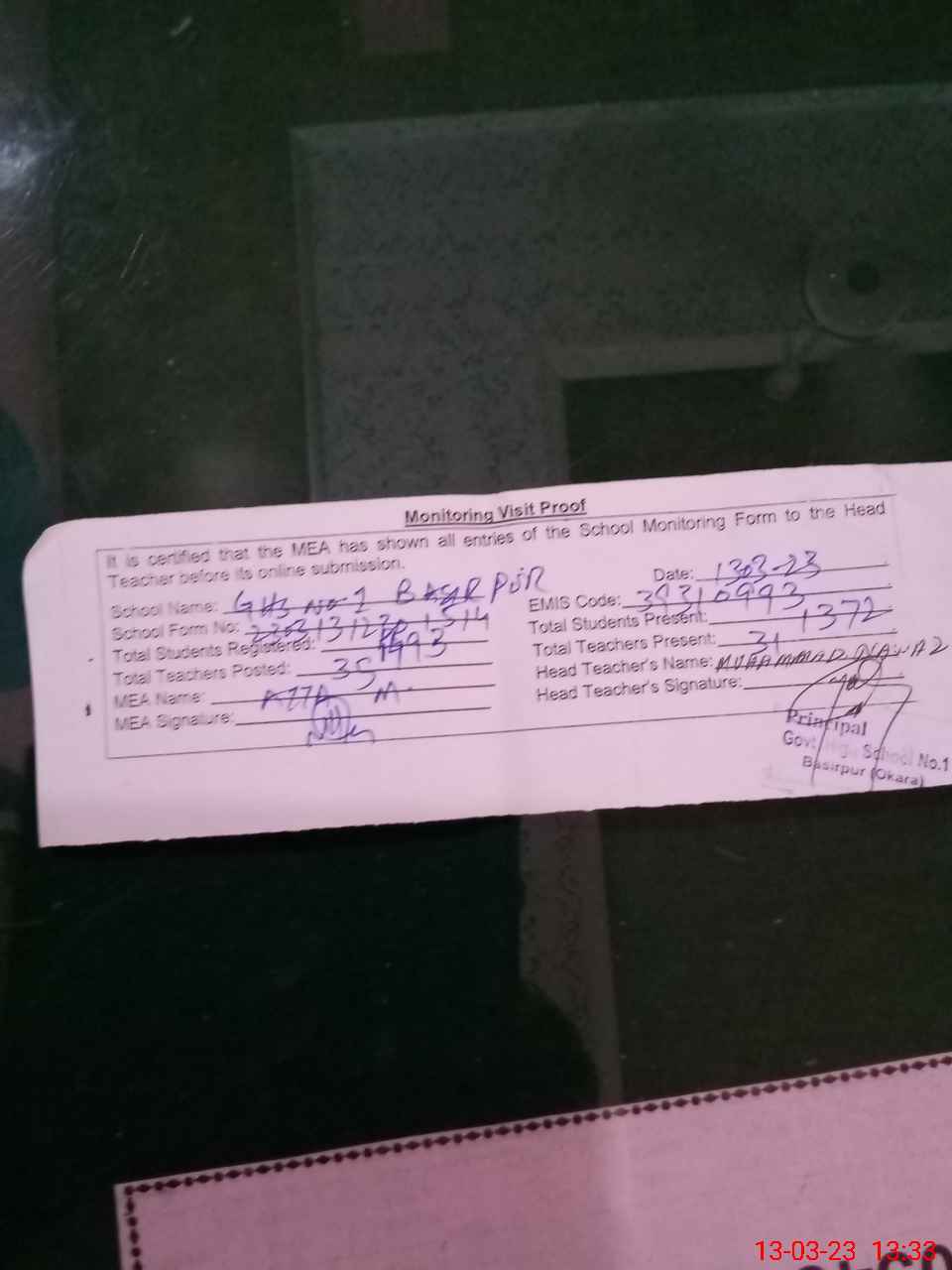 | EMIS Code: 39310993 | Name of School: GHS NO. 1 BASIR PUR MAIN ROAD | |||