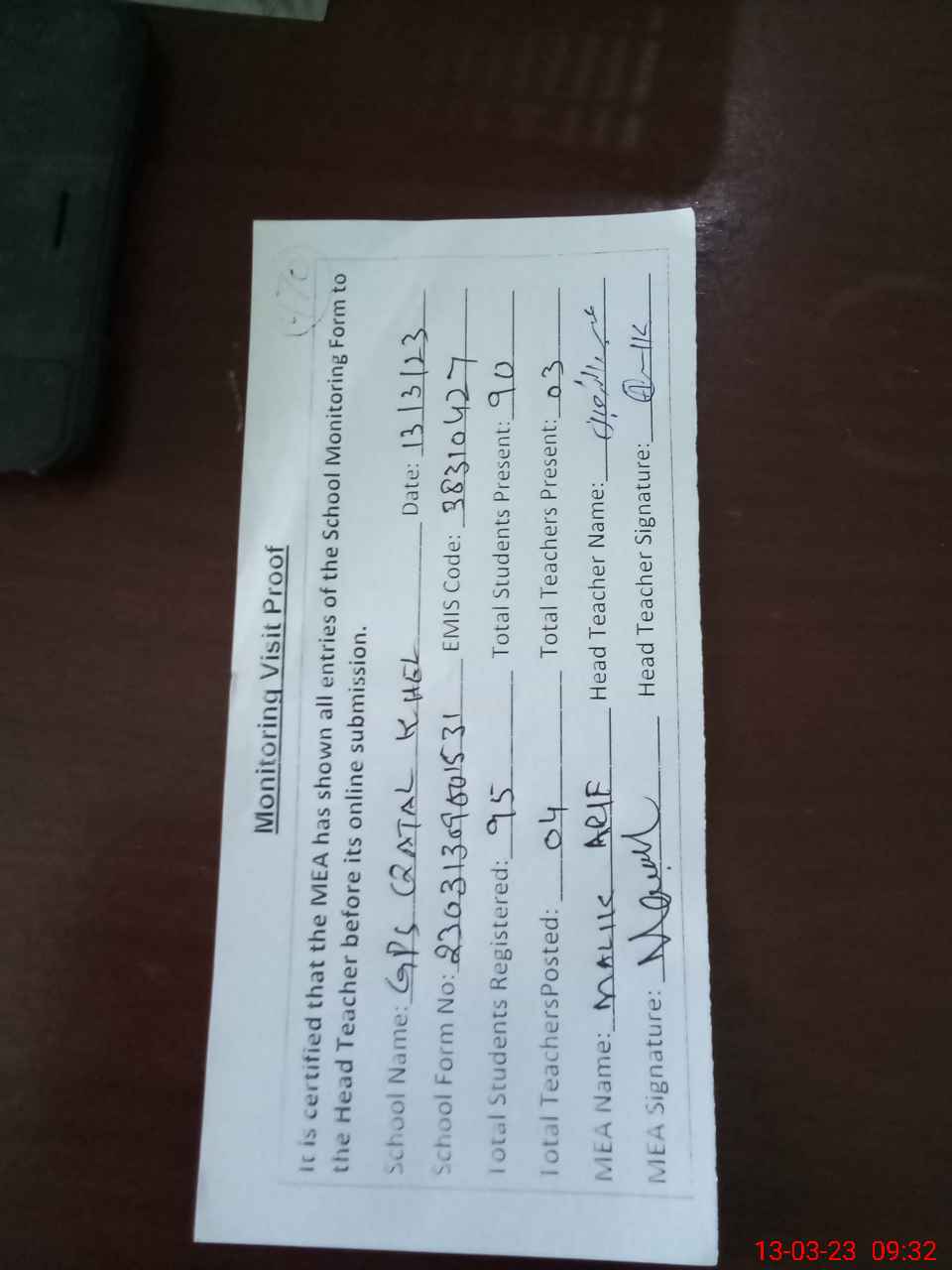 | Attendance Register | Head Teacher | MEA with School | Visit Proof |