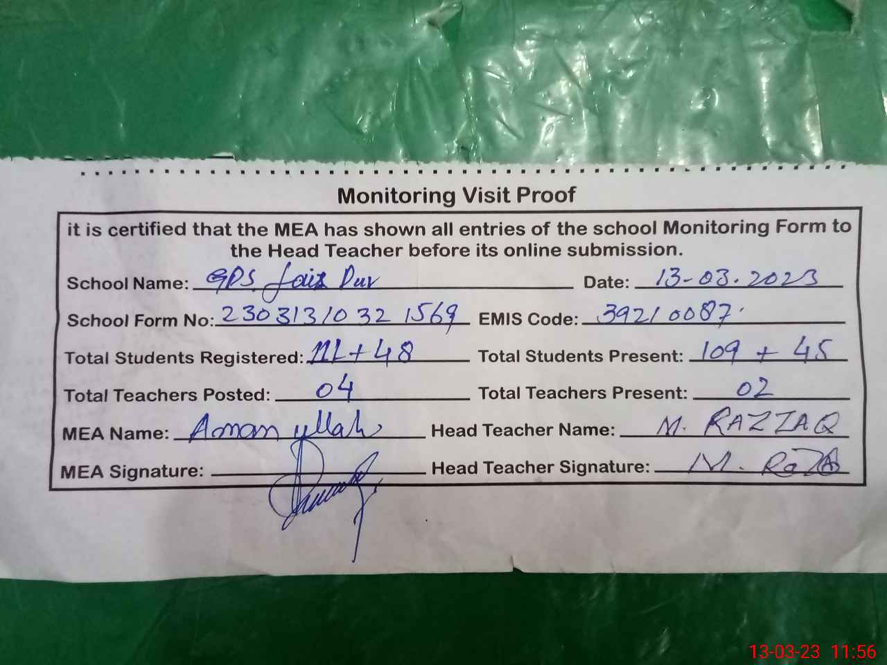 | Attendance Register | Head Teacher | MEA with School | Visit Proof |