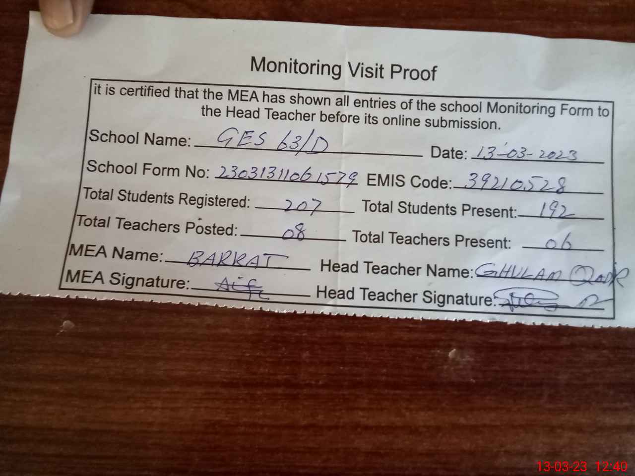 | Attendance Register | Head Teacher | MEA with School | Visit Proof |