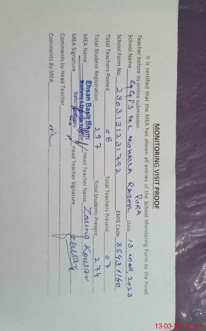 | EMIS Code: 35431160 | Name of School: GGPS MC MOHALLA RASOOL PURA | |||