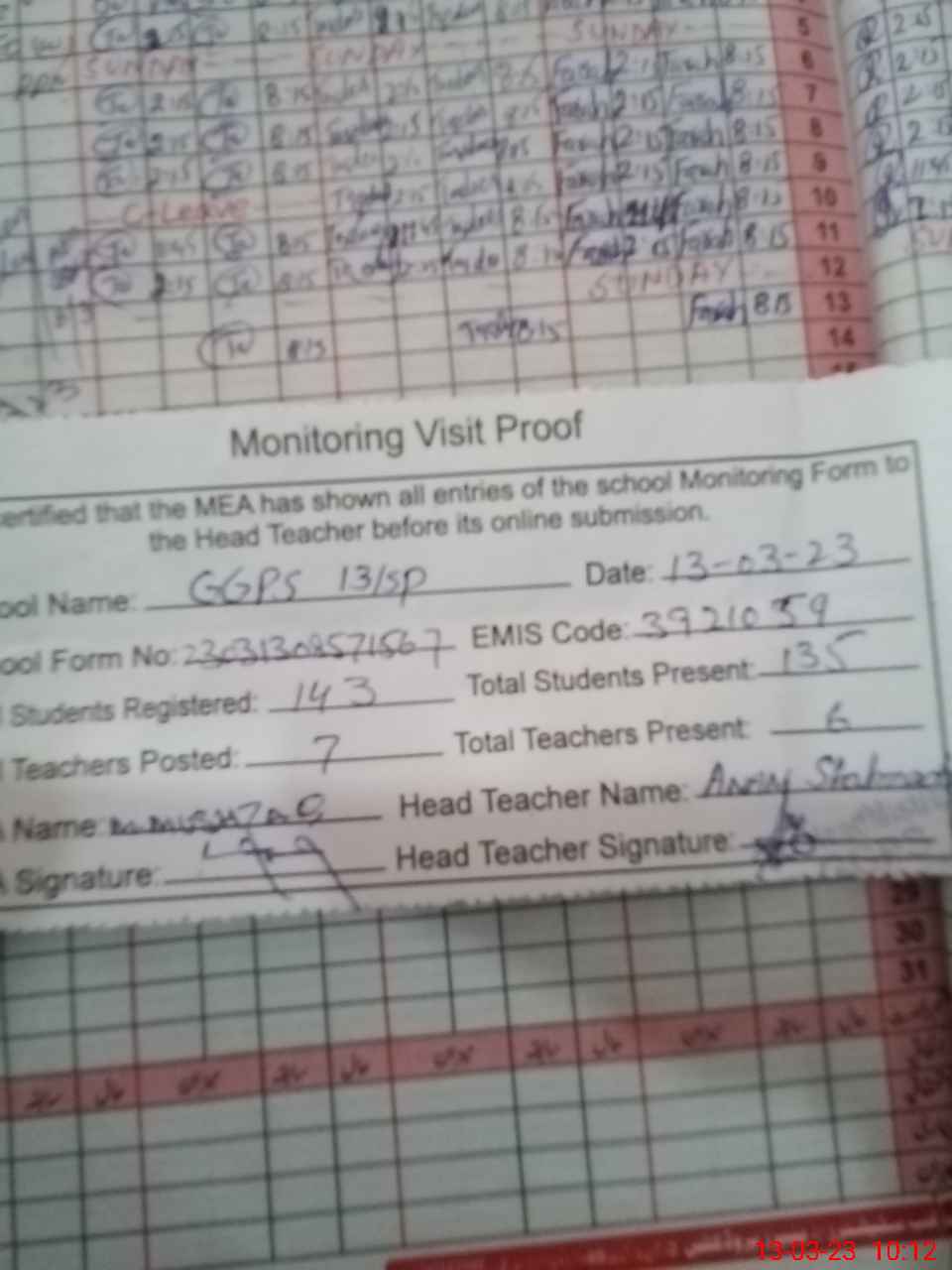 | Attendance Register | Head Teacher | MEA with School | Visit Proof |