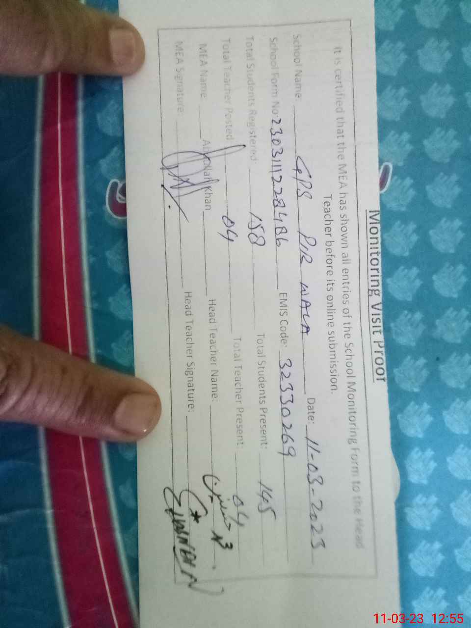 | Attendance Register | Head Teacher | MEA with School | Visit Proof |