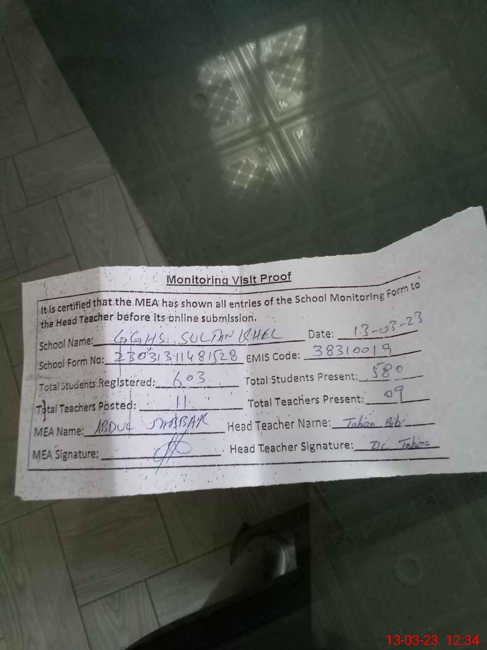 | Attendance Register | Head Teacher | MEA with School | Visit Proof |