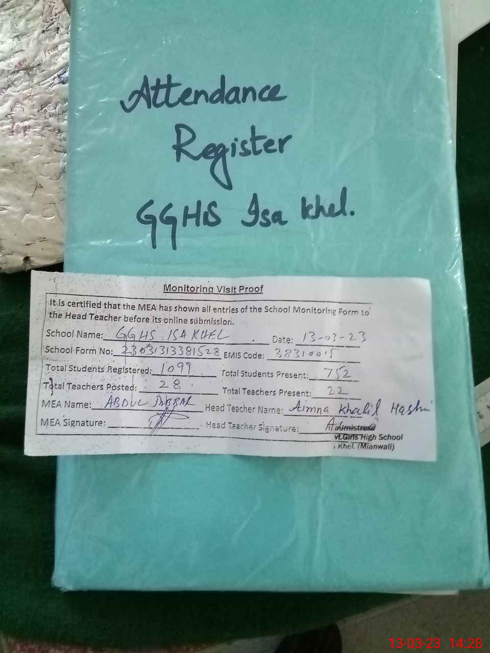 | Attendance Register | Head Teacher | MEA with School | Visit Proof |