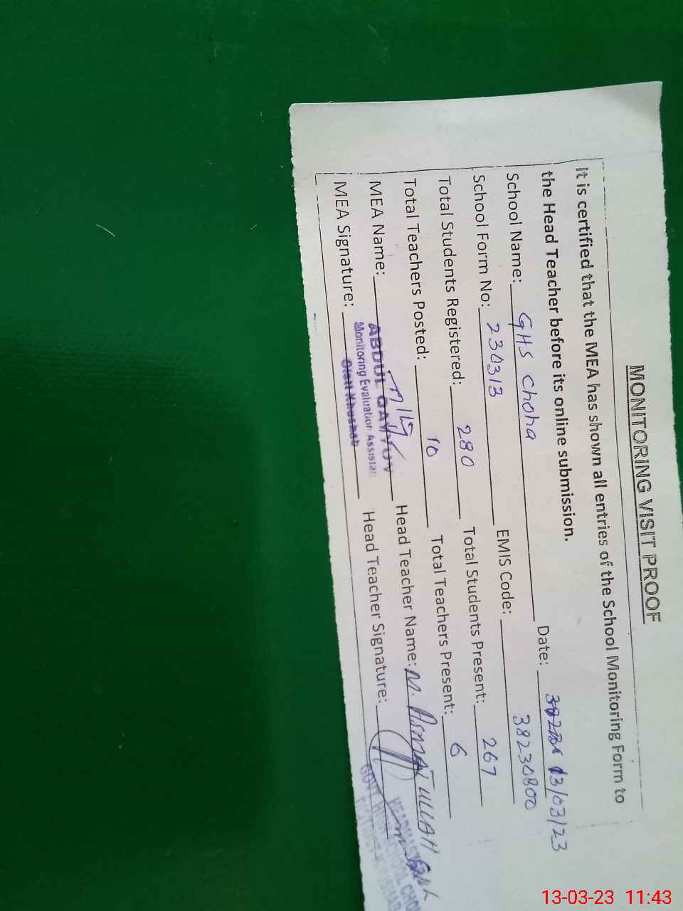 | Attendance Register | Head Teacher | MEA with School | Visit Proof |