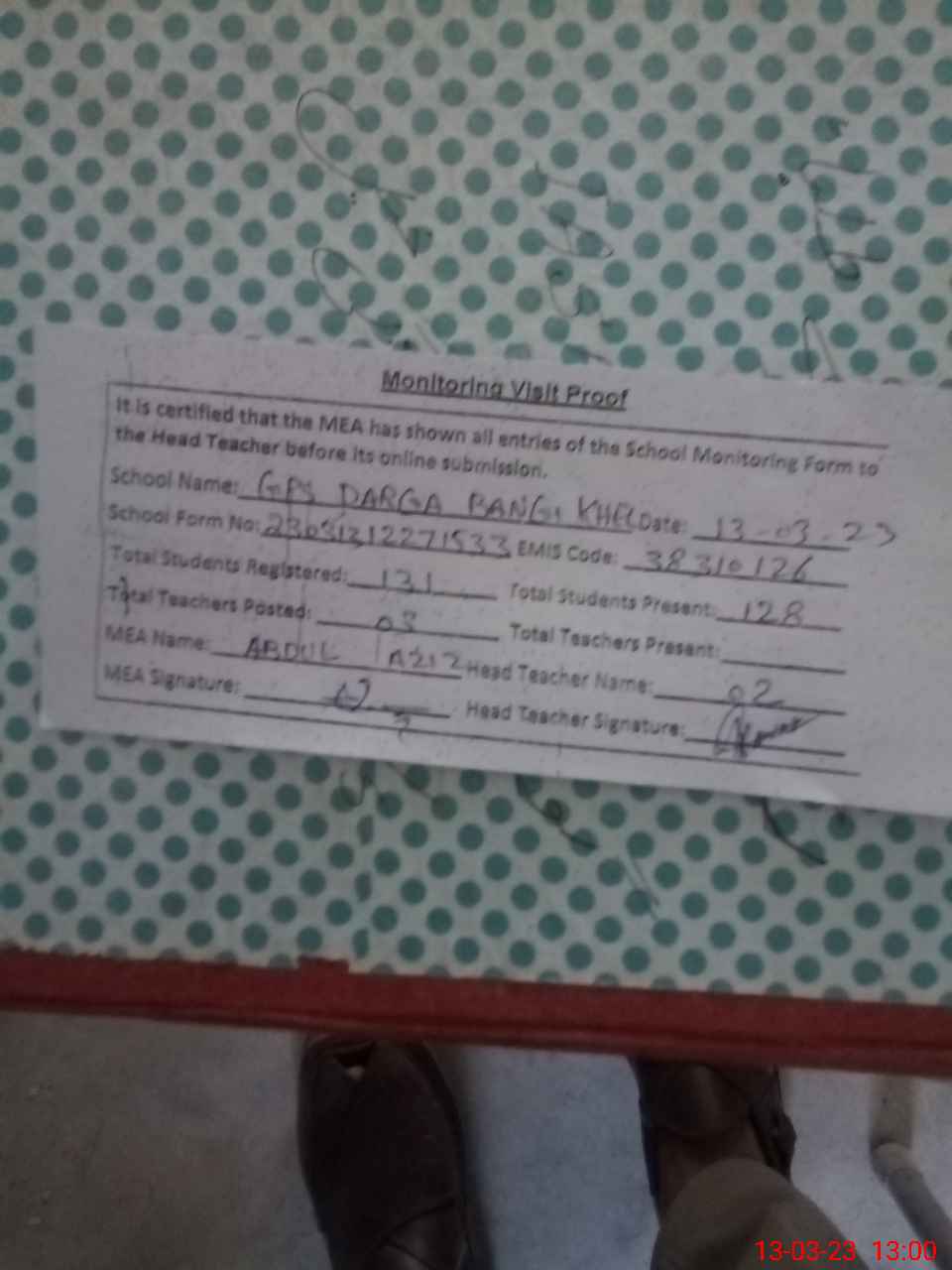 | EMIS Code: 38310126 | Name of School: GPS DARGA BANGI KHEL | |||