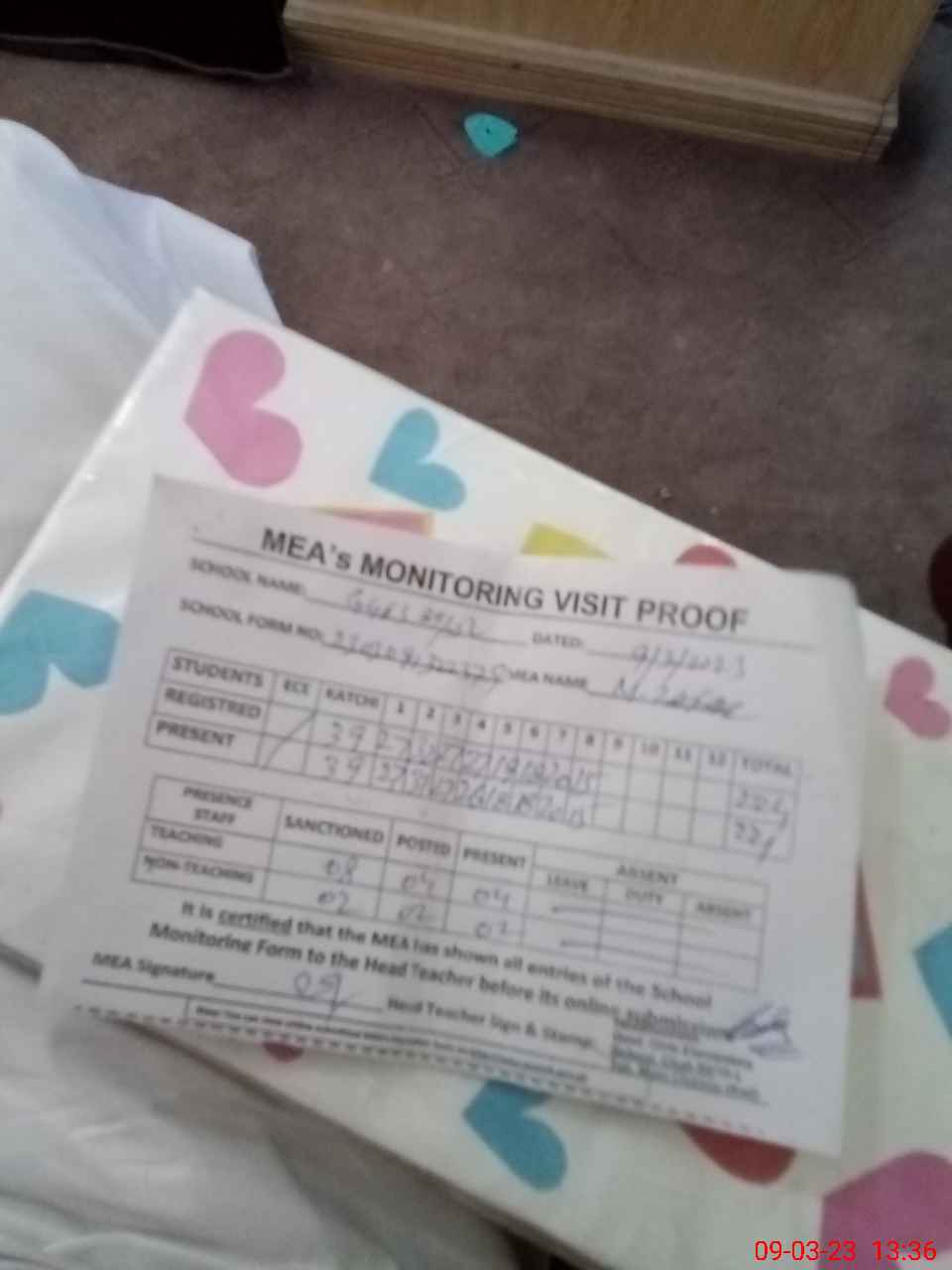 | Attendance Register | Head Teacher | MEA with School | Visit Proof |