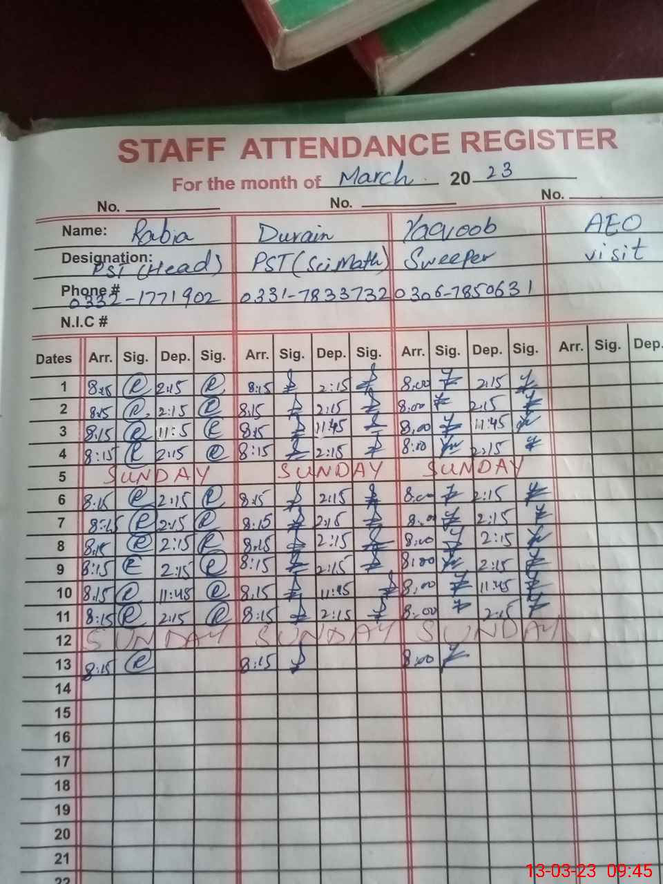 | Name: RA**** NO**** Designation: (School Headmaster's/Headmistress's) PST Phone/Cell Number: 03**** |
