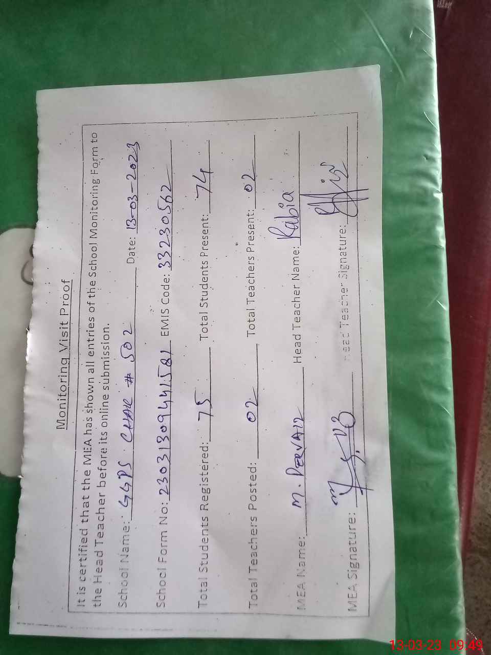 | Attendance Register | Head Teacher | MEA with School | Visit Proof |