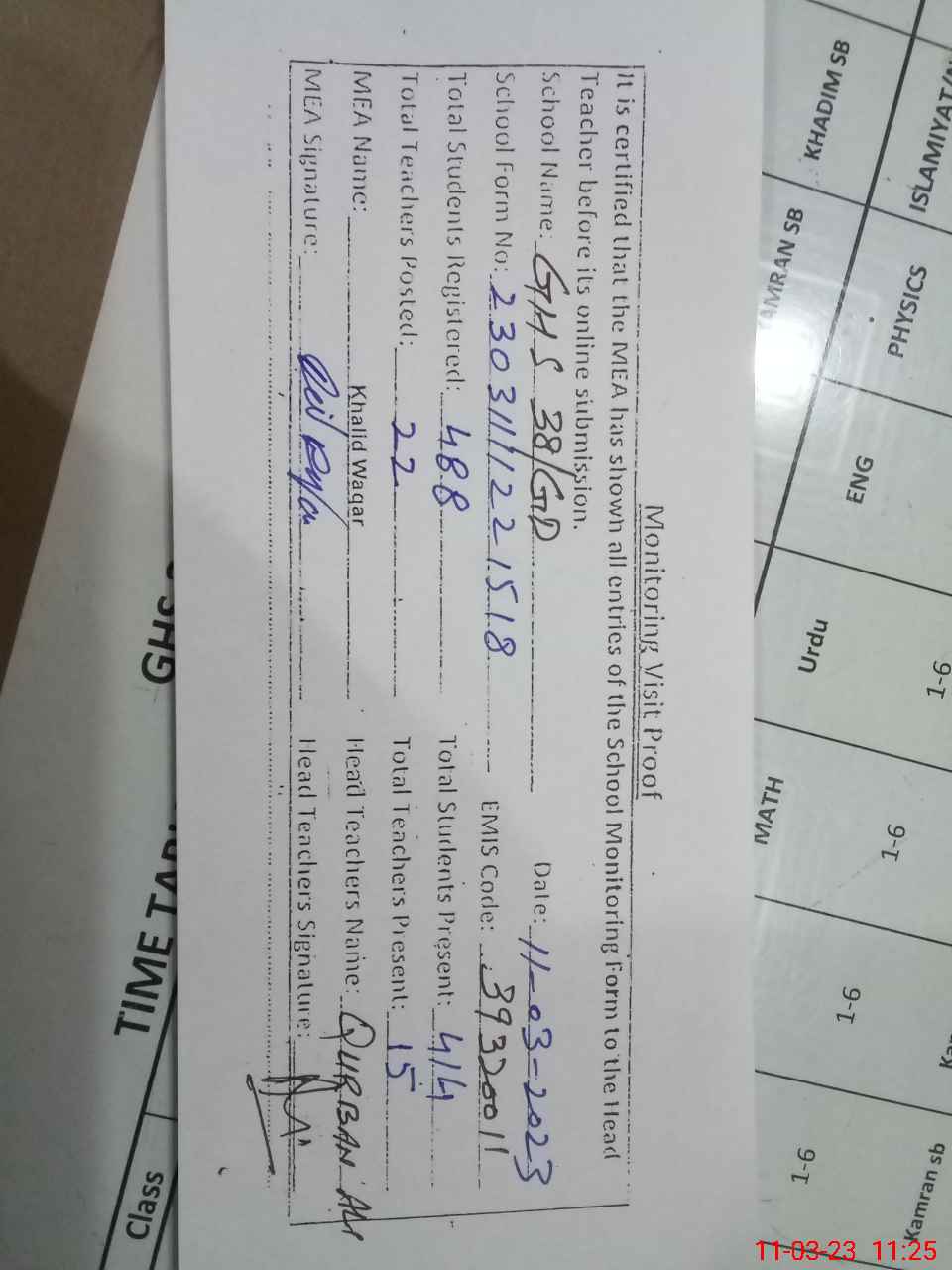 | Attendance Register | Head Teacher | MEA with School | Visit Proof |